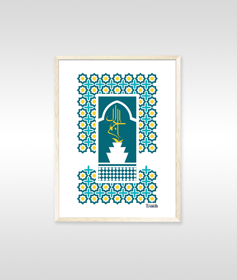 La calligraphie arabe du mot “Hob” est mise en valeur au centre, entourée de motifs évoquant les zelliges marocains. L’arche et la fontaine rappellent la fraîcheur des riads et la sérénité des jardins orientaux.