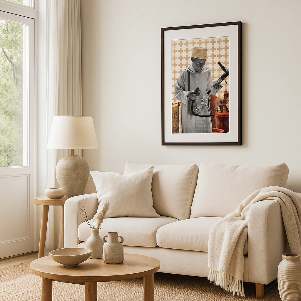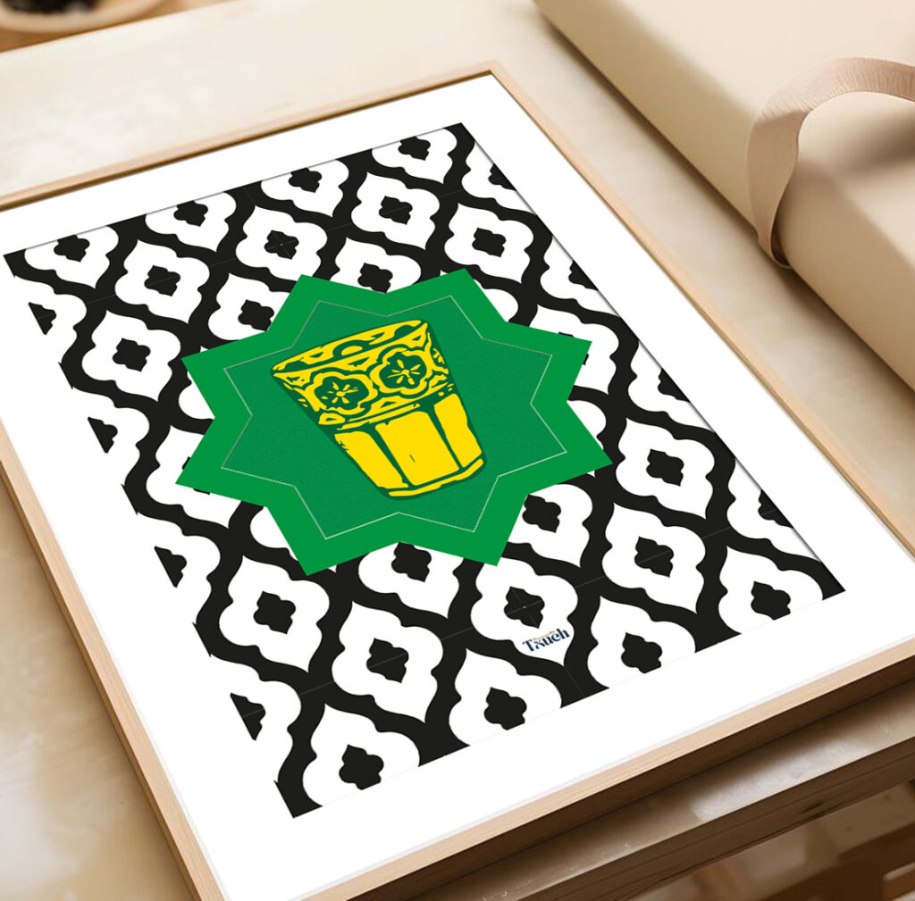 Les teintes chaudes — or, ocre et rouge — créent une atmosphère à la fois festive et intemporelle, tandis que le motif géométrique doré en arrière-plan illumine la composition comme un écrin précieux. Les détails minutieux rappellent que la musique et les motifs traditionnels sont des langages qui transmettent histoire, émotion et culture.