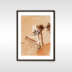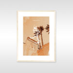 Les nuances terreuses rappellent les murs en pisé et les ruelles ensoleillées de la ville rouge, tandis que les silhouettes des palmiers ancrent la composition dans une atmosphère à la fois apaisante et vibrante.