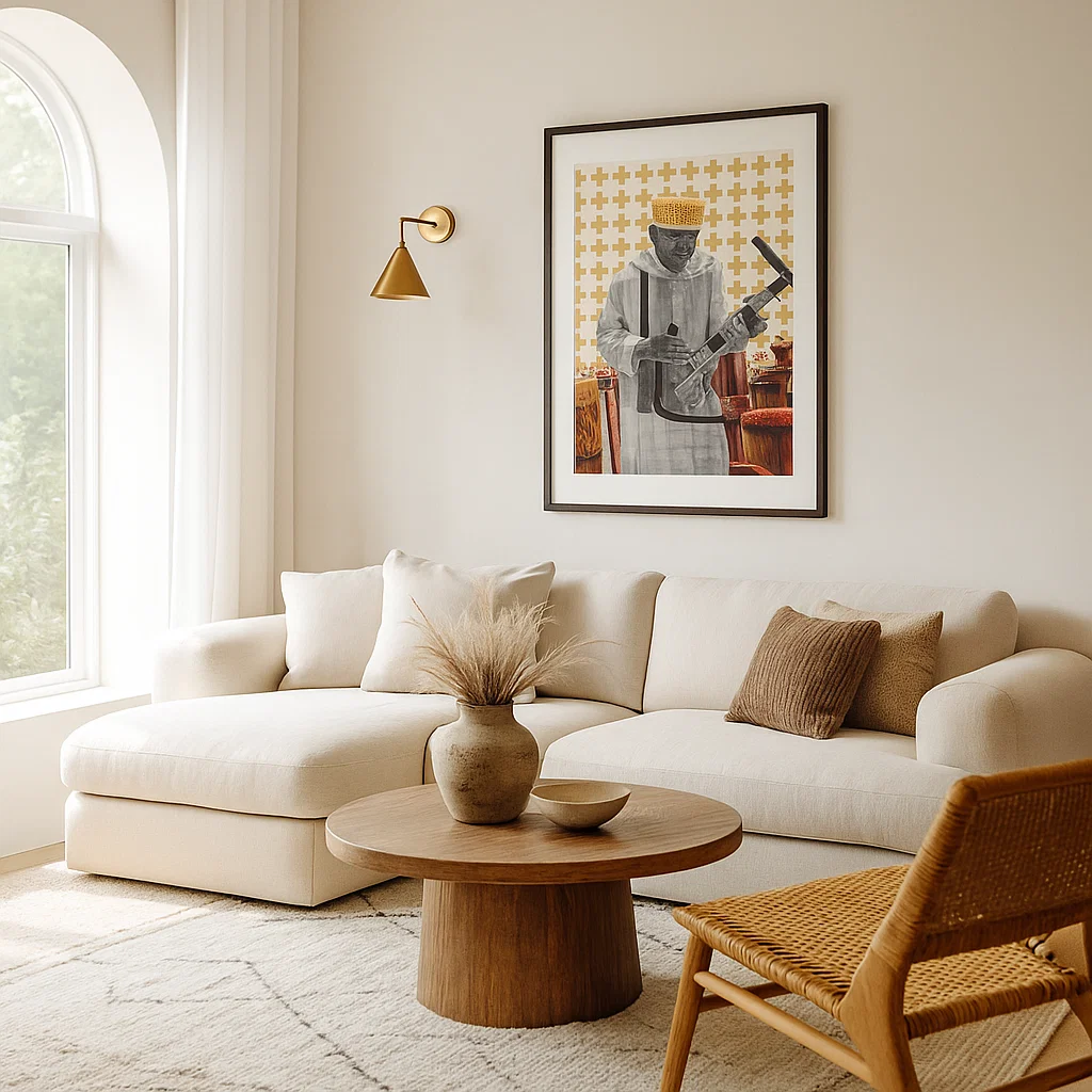 Les teintes chaudes — or, ocre et rouge — créent une atmosphère à la fois festive et intemporelle, tandis que le motif géométrique doré en arrière-plan illumine la composition comme un écrin précieux. Les détails minutieux rappellent que la musique et les motifs traditionnels sont des langages qui transmettent histoire, émotion et culture.