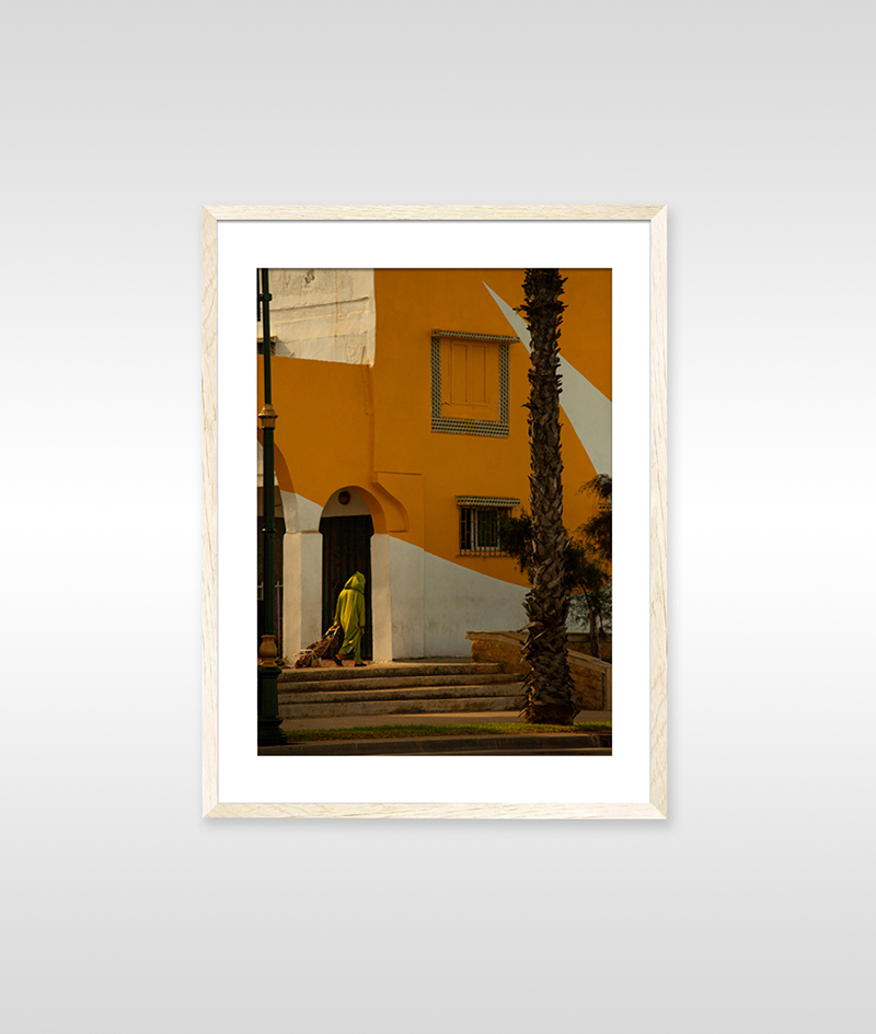 Au premier plan, une femme vêtue du “ngab”, tenue traditionnelle marocaine que l’on croise désormais rarement dans les rues, incarne la mémoire vivante d’un mode de vie révolu. Sa silhouette ajoute une profondeur poétique à l’image, comme une passerelle entre hier et aujourd’hui.